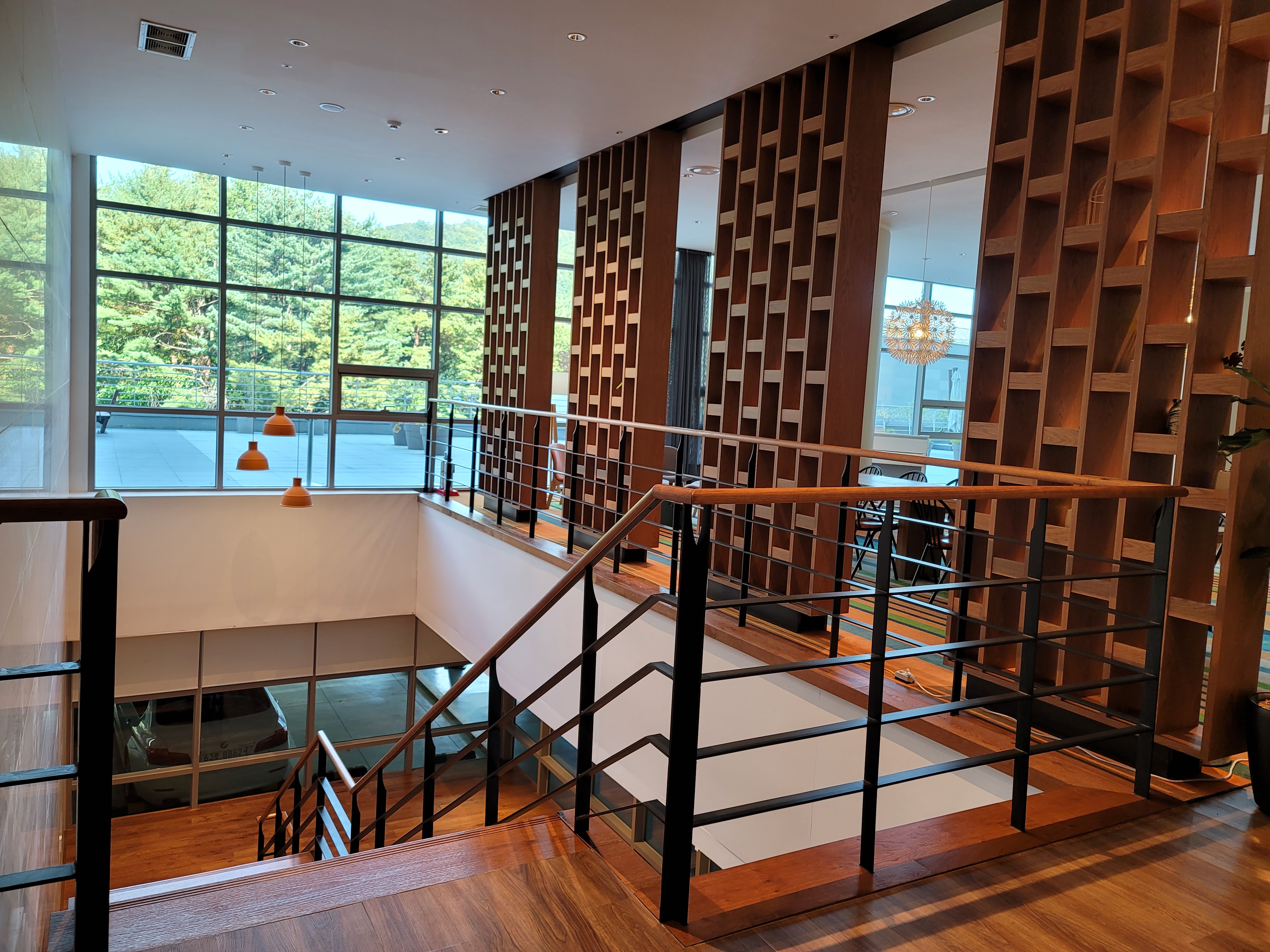 자, 그럼 이제 체크인하러 가 볼까요? 엘리버에터에서 오른쪽으로 까페와 도서관이 있다면 왼쪽으로 꺾으면 지하주자창에서 올라오는 계단이 보이구요