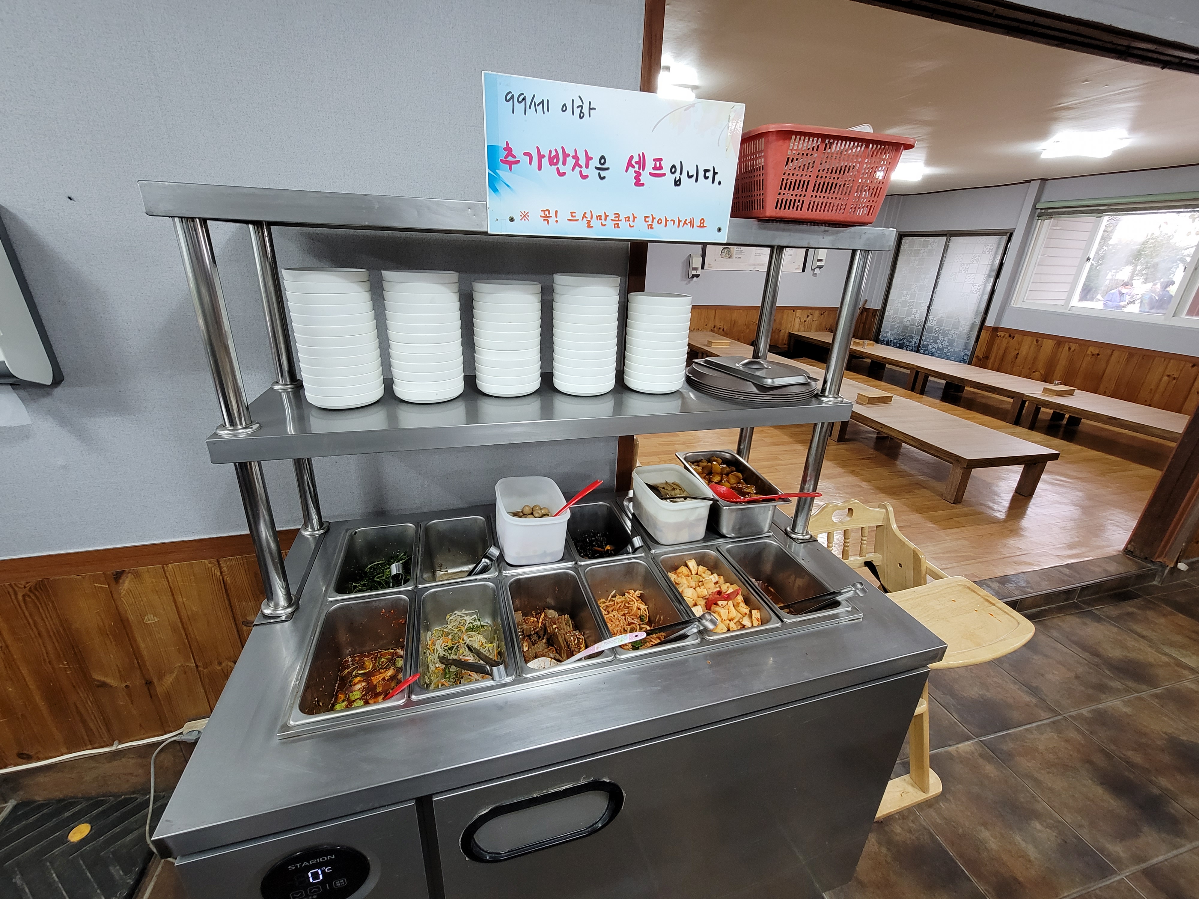 반찬이 12가지나 있어요. 추가로 먹을 있게 셀프 반찬대가 준비되어 있어요.