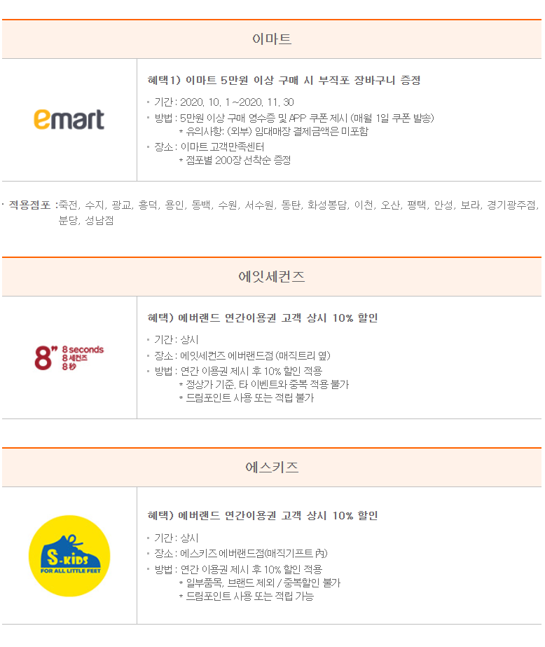 에버랜드 연간회원이신 분들 많으시죠? 저희도 연간회원인데 요즘 코로나라 많이 이용을 못하고 있어요. 오랜만에 홈페이지에 들어가보니 제휴 혜택이 생각보다 많더라구요. 여러가지 있으니 한 번 확인해 보시고 가실 일 있으시면 이용하세요.