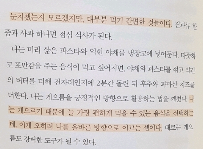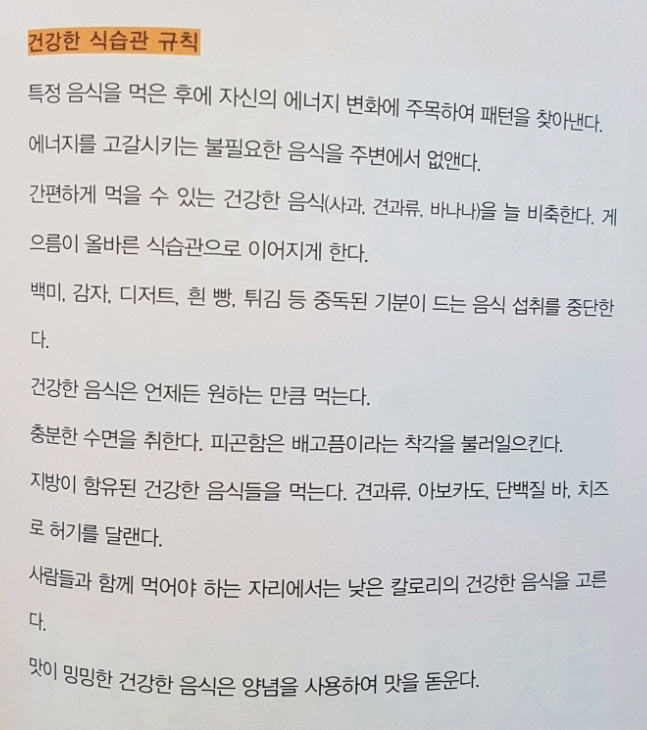 작가에게 올바른 식사는 결론적으로 저탄수화물인데 올바른 식습관을 가지기 위해 무엇을 먹지 않는 일보다는 원하는 것은 무엇이든 먹되 먹고싶은 것을 바꿀 수 있는 점진적 단계를 이용하기