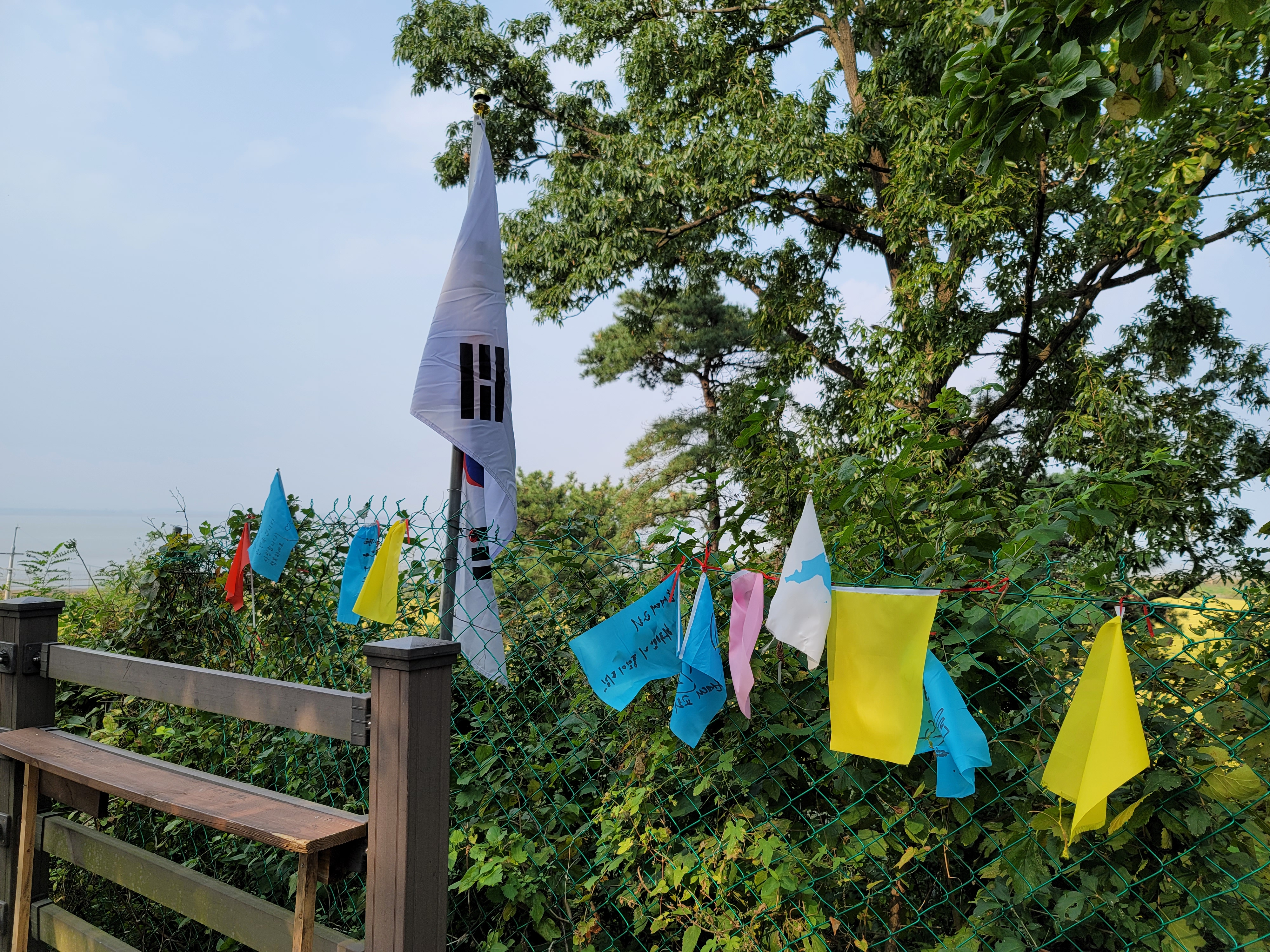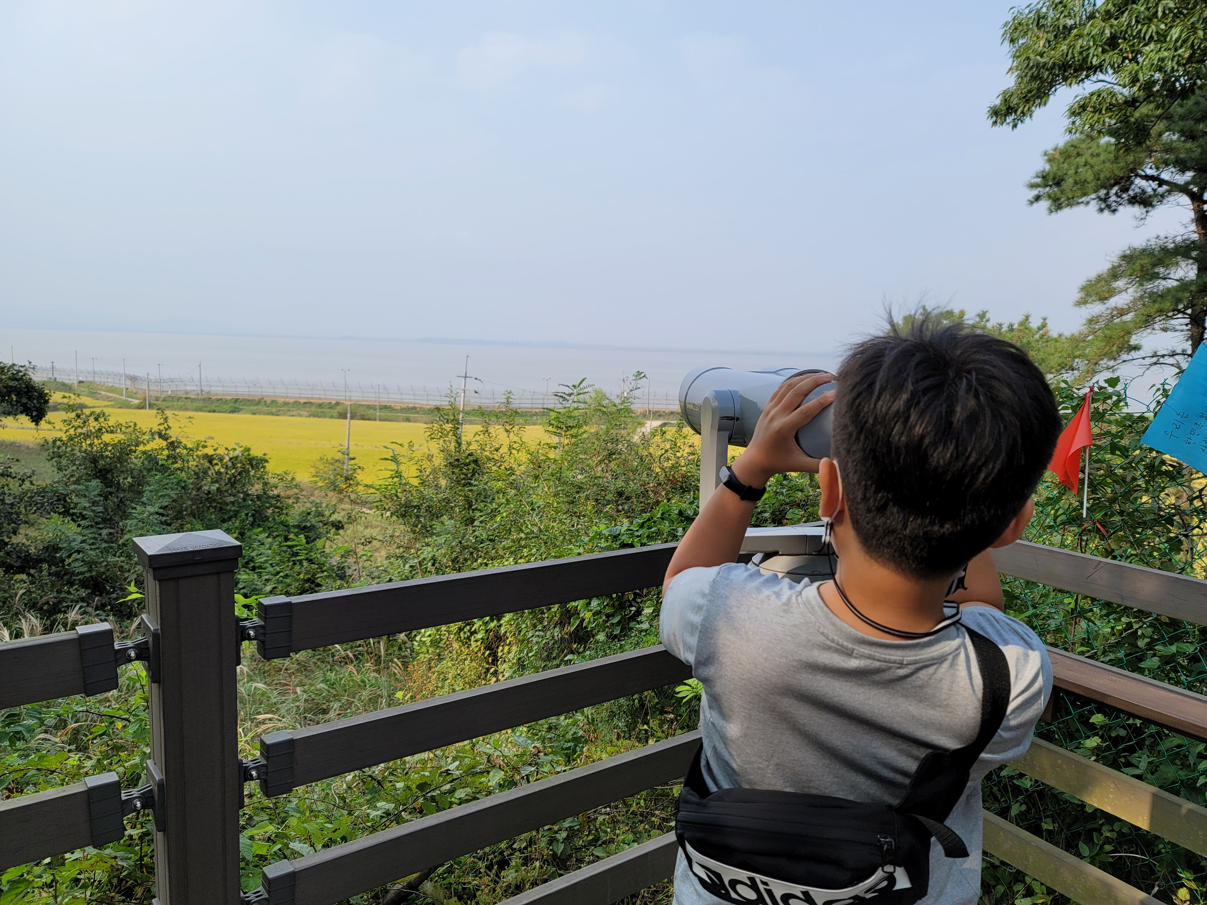 올라가니 이렇게 전망대가 나와요. 이날은 좀 흐려서 잘 안 보이는데 맑은 날은 바다 건너 연백군쪽이 정말 잘 보인다 하시더라구요. 흐려도 망원경으로 보니 북한 주민들 다니는 모습 다 보였어요.