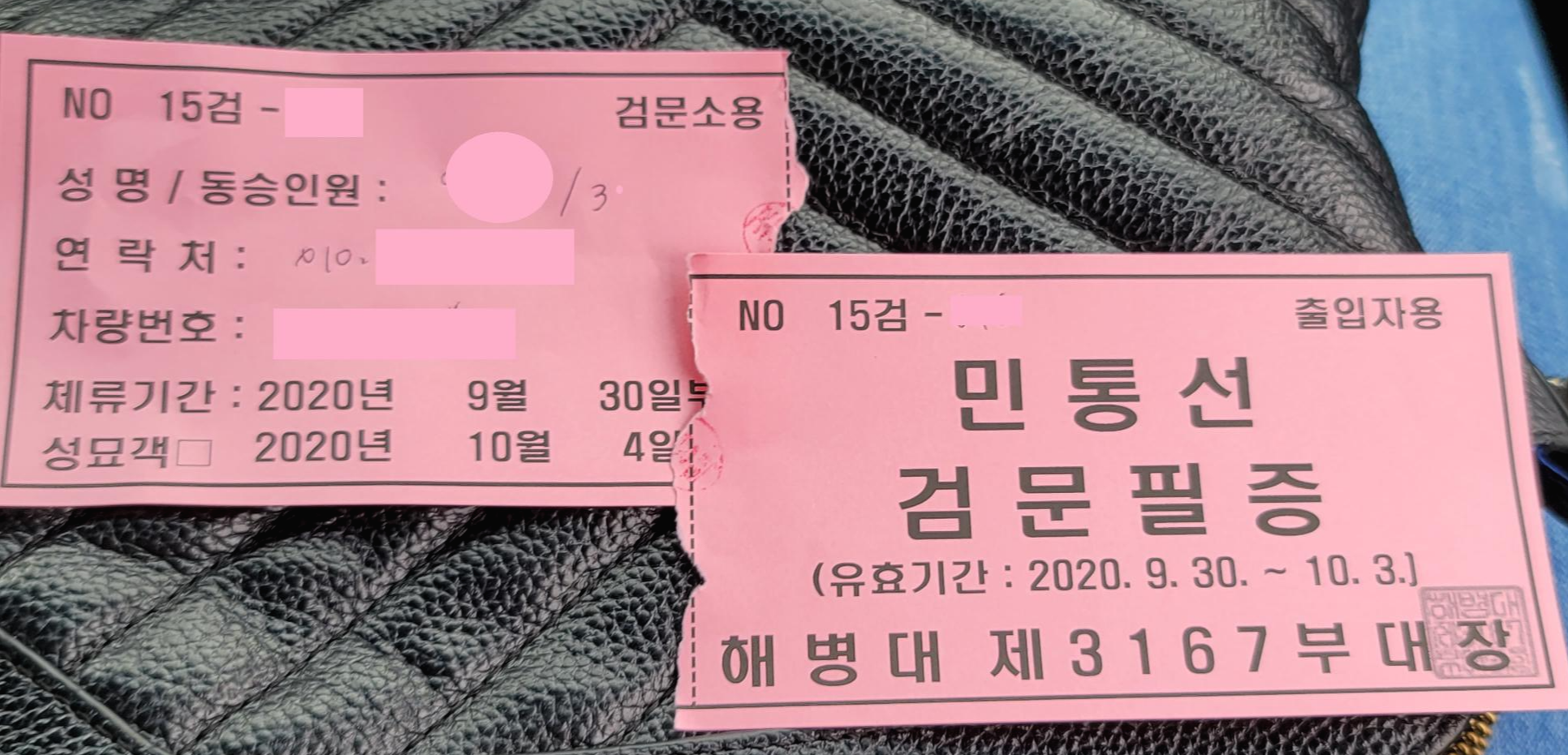 이렇게 동승한 인원과 연락처 차량번호등을 작성해서 오른쪽은 차에 올려두고 왼쪽은 제출합니다.