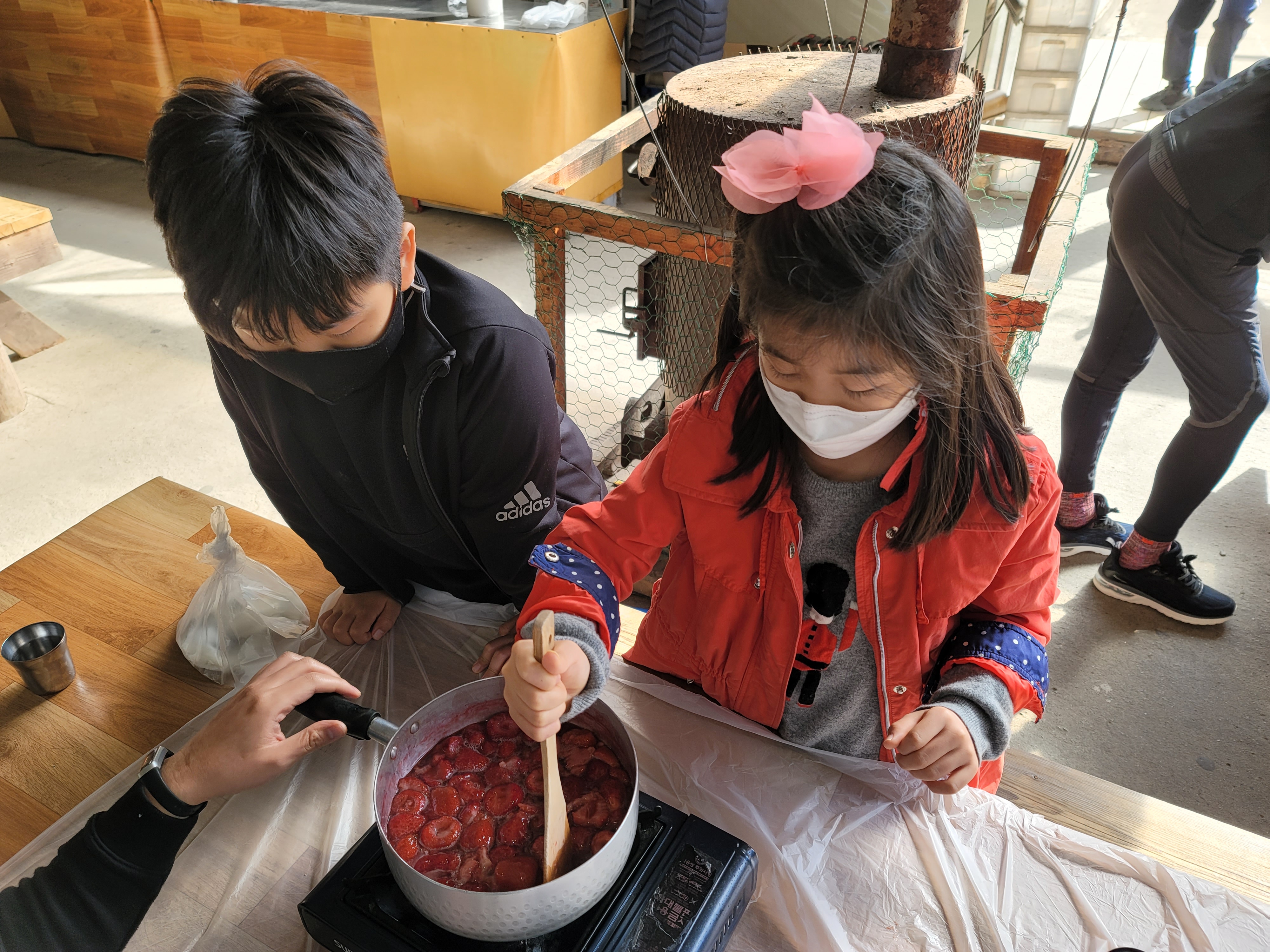바람떡을 만들고 나서 그 다음 체험은 "딸기잼"과 "고추장" 만들기 입니다. 둘 중 하나를 택해야 하는데, 저희 가족은 애들의 의견을 적극 반영하여 "딸기잼"을 선택했습니다.