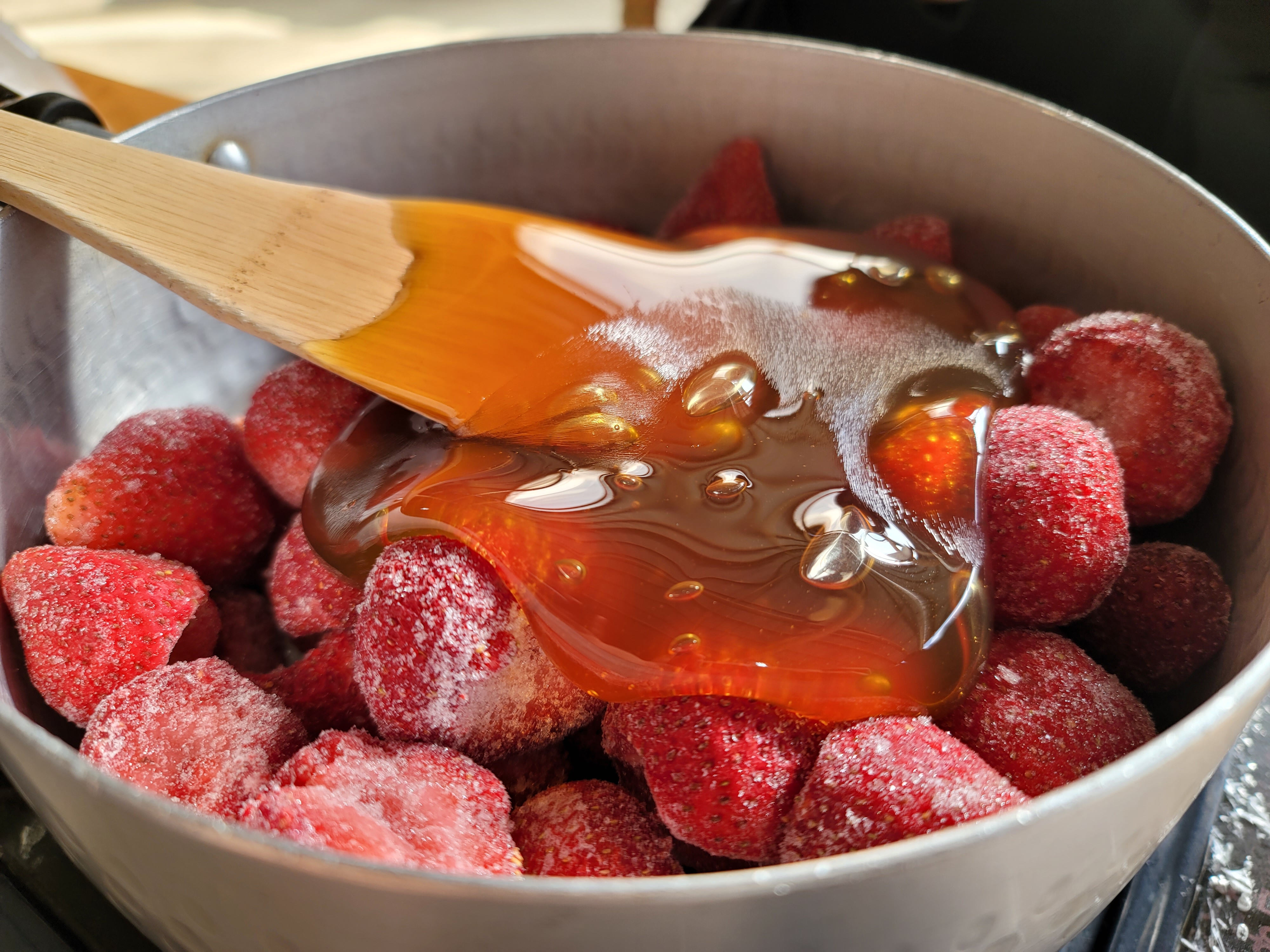 조청과 딸기에 열을 가해서 천천히 녹입니다. 다 녹일때까지 약 40분 정도 걸린것 같습니다.