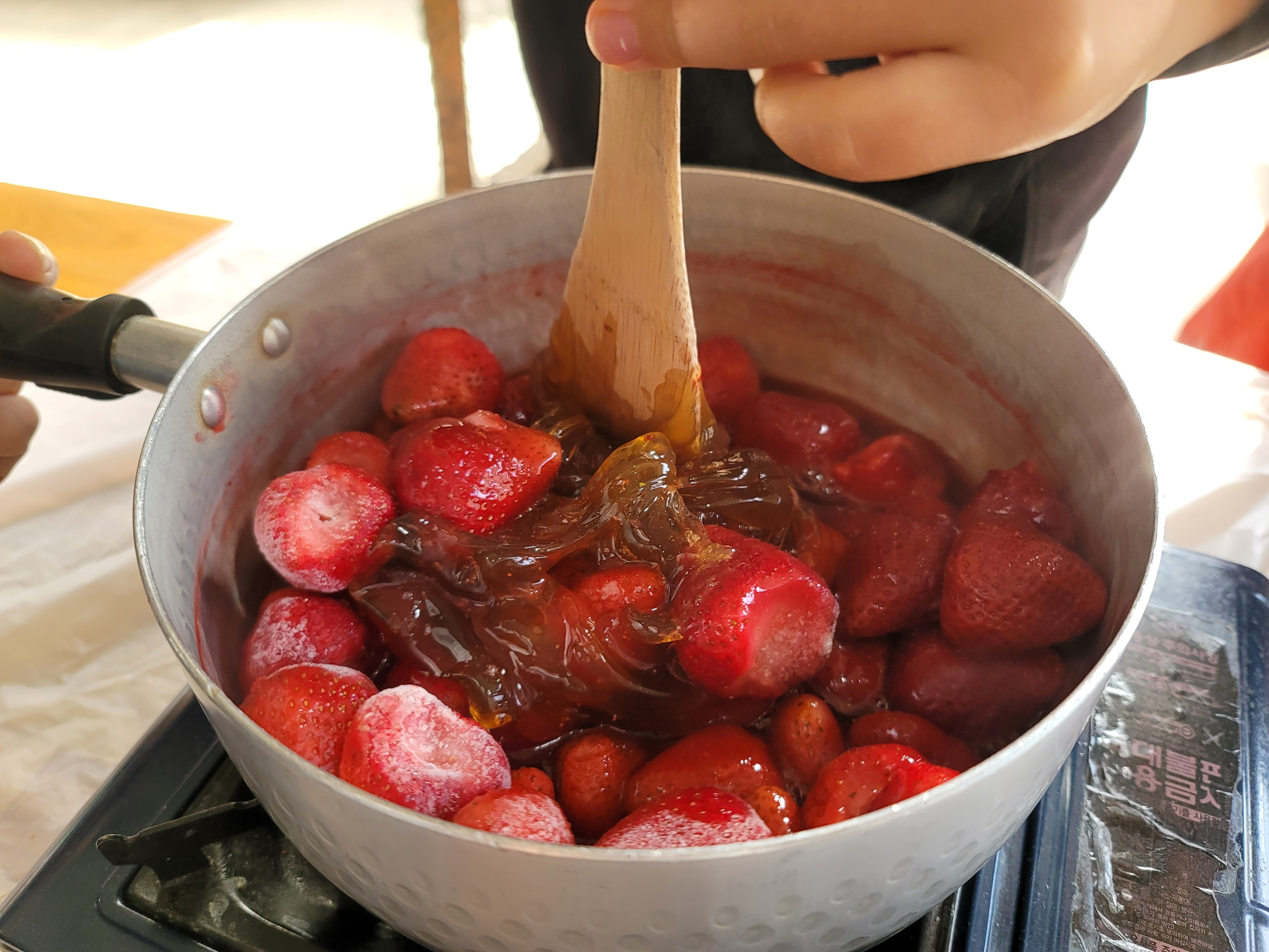 주걱으로 계속 딸기를 으깨주면서 저어줘야 합니다.