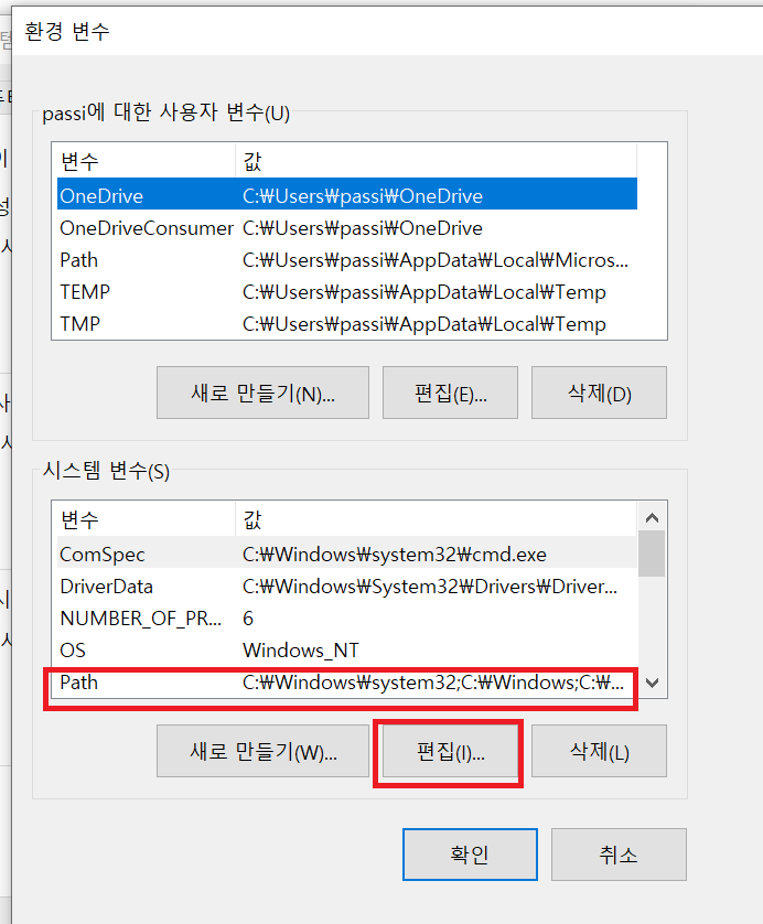'시스템 변수(S)'에서 'Path'를 선택하고 '편집'을 클릭합니다.
