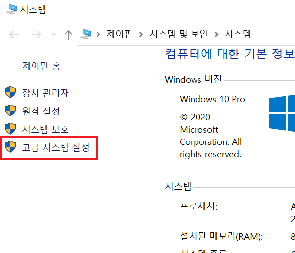 윈도우키+R 을 눌러서 "sysdm.cpl"이라고 입려해주면 시스템 속성으로 바로 진입합니다.