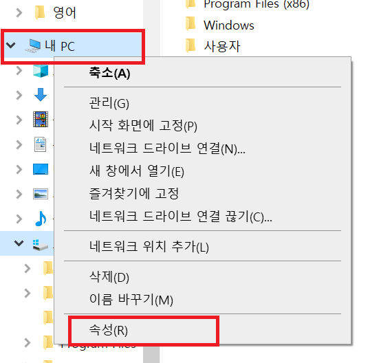 '내PC'에서 마우스 우클릭하여 '속성(R)'을 클릭합니다.