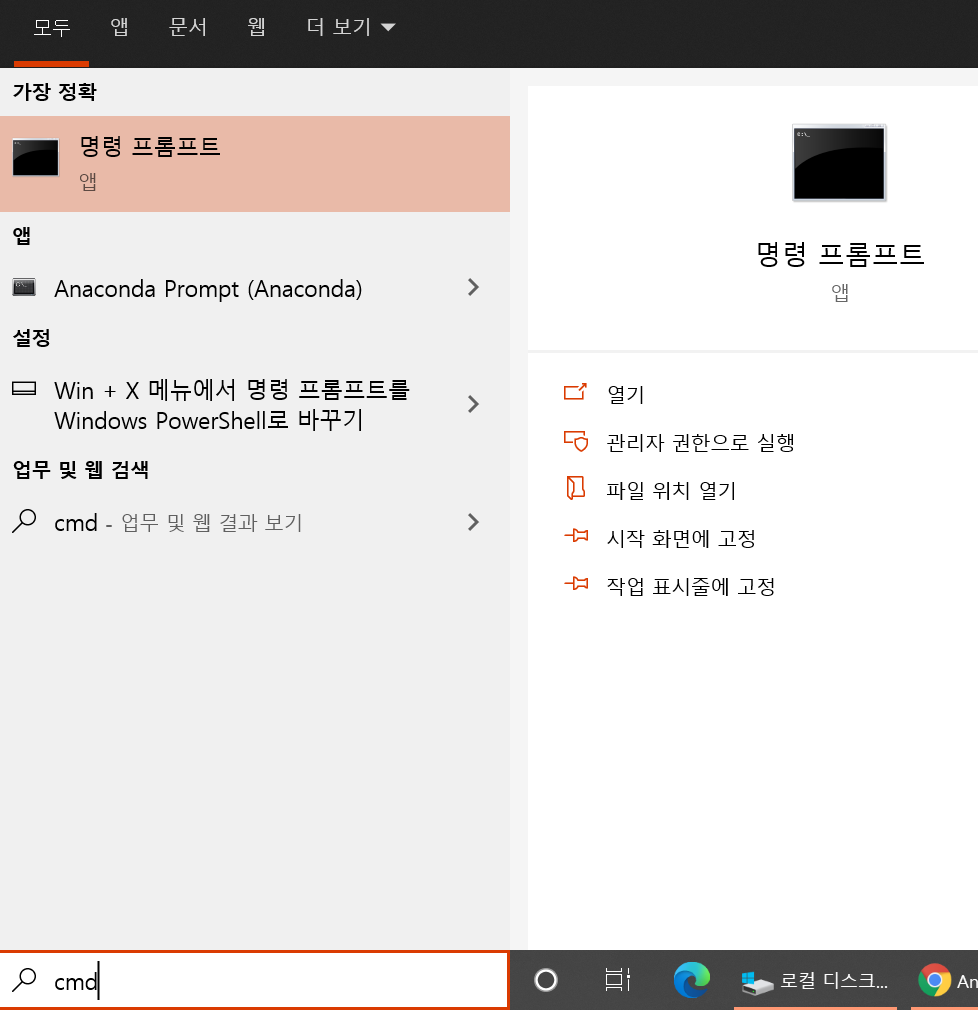 윈도우 탐색창에 'cmd'라고 입력을 한 후 엔터를 칩니다.