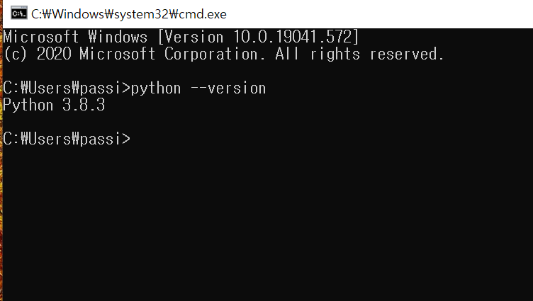 다시 cmd에서 실행해 보면 버전이 이제는 나타네요.