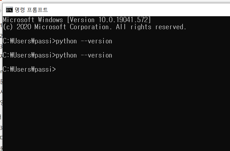 명령창에서 파이썬 버전을 확인해 봅니다. 버전 확인이 안되네요. 경로가 달라서 이렇게 버전확인이 되지 않습니다.