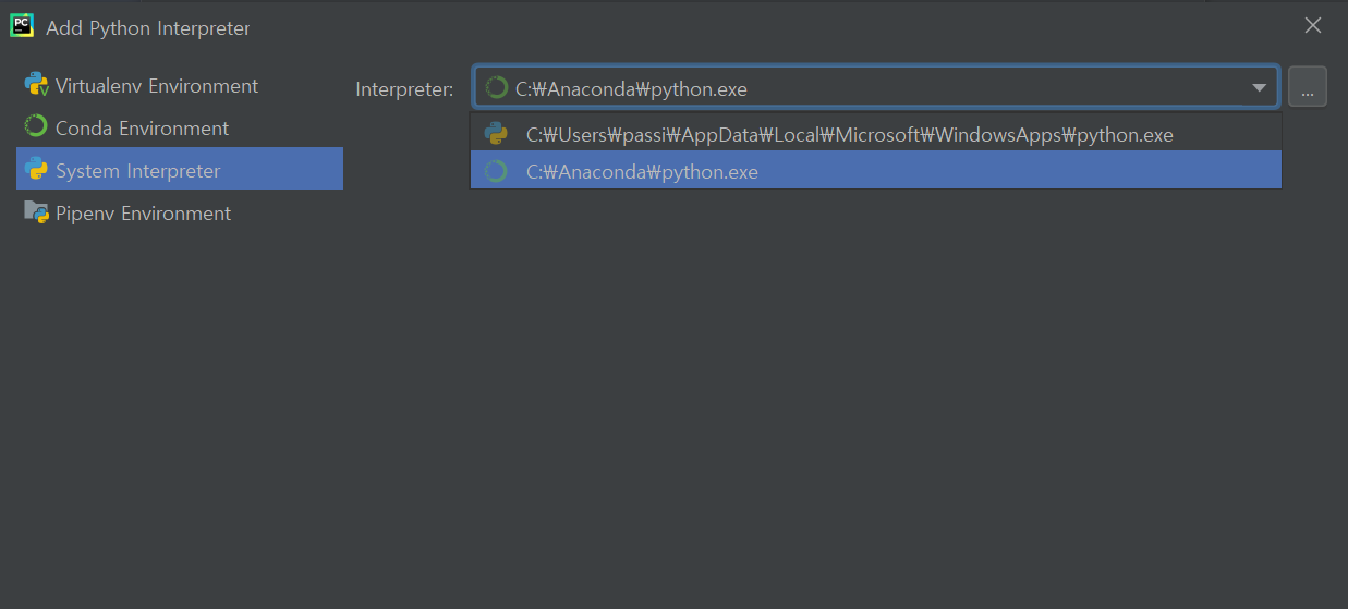 'System Interpreter'에서 "C:\Anaconda\python.exe"를 선택합니다.