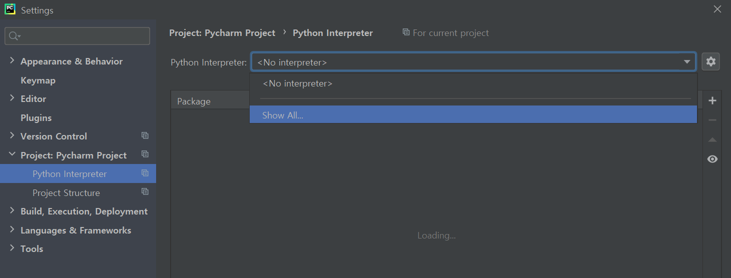 왼쪽 메뉴에서 'Python Interpreter'를 클릭하고