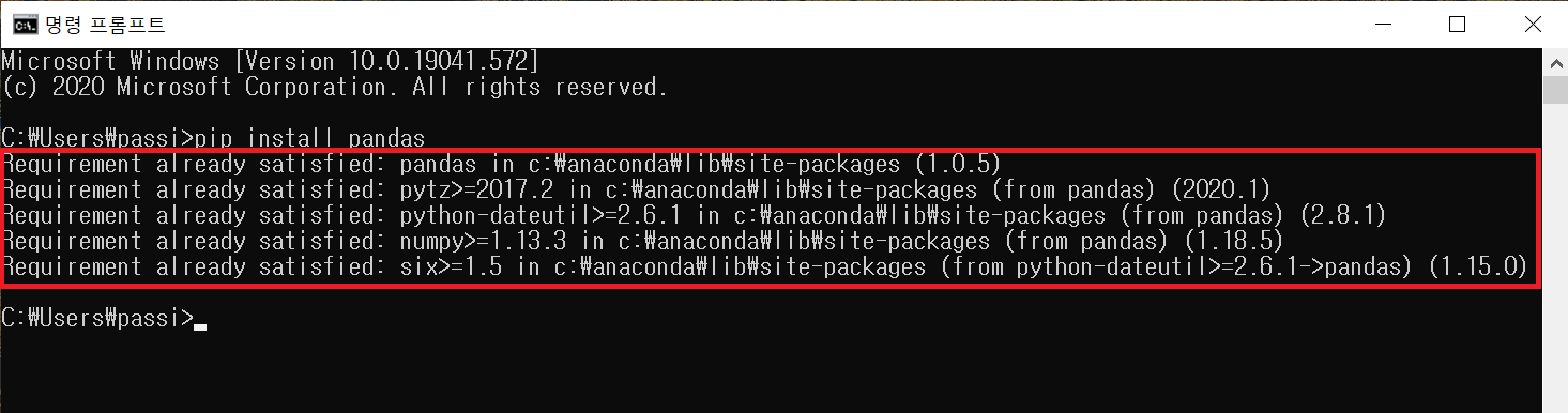 저는 이미 설치한 pandas라는 모듈로 했기에 아래 그림의 네모박스와 같이 이미 설치되어 있다고 표시됩니다.