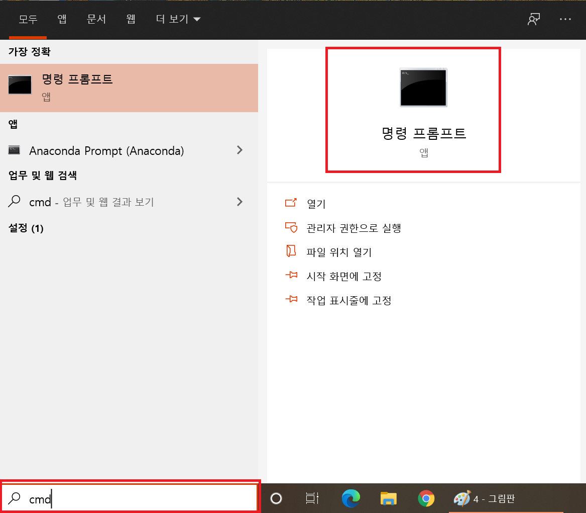 윈도우 검색창에서 "cmd"를 입력하여 "명령 프롬프트"로 들어갑니다.