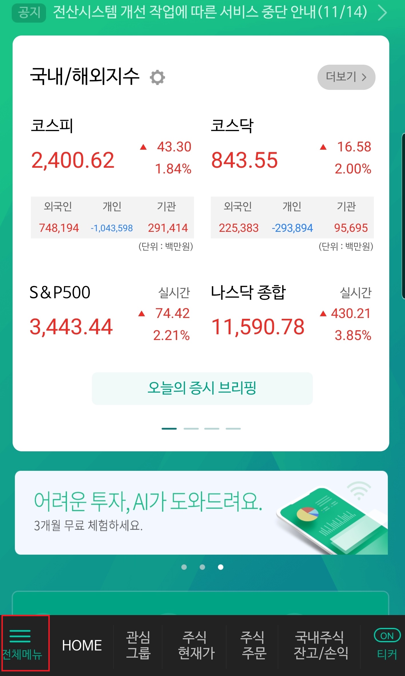 어플 하단 좌측에 "전체메뉴"를 클릭합니다.