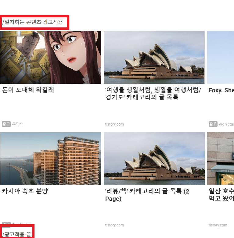 위의 그림과 같이 바꾸면 블로그 화면에서 깔끔하게 "//일치하는 콘텐츠 광고적용"과 "//광고적용 끝"이 사라집니다.