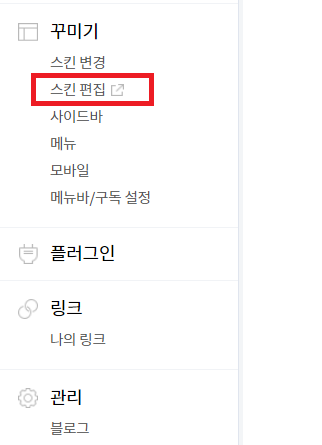 오른쪽에 있는 메뉴에서 '스킨편집'으로 들어갑니다.