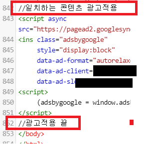 html 코드에서 "ctrl + F" 눌러서 검색하거나 스크롤을 내려서 검색하면 위의 그림과 같이 "//일치하는 콘텐츠 광고적용"이 보입니다.