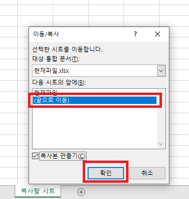 복사할 시트 위치를 선택합니다. 저는 "(끝으로 이동)"을 선택하겠습니다.