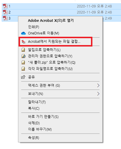 마우스 오른쪽을 클릭해서 "Acrobat에서 지원되는 파일 결합..."을 클릭합니다.
