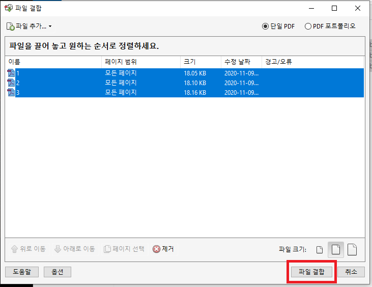 합칠 파일들을 마우스로 드래그해서 선택합니다.
