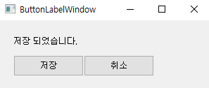 각 버튼에 연결하는 함수입니다. 저장을 누르면 '저장 되었습니다.', 취소를 누르면 '취소 되었습니다.'가 레이블에 표시됩니다.