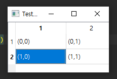 self.tableWidget.setItem(0, 0, QTableWidgetItem('(0,0)')) 처럼 각 위젯에 아이템값을 설정합니다.