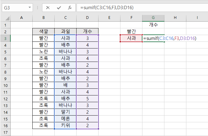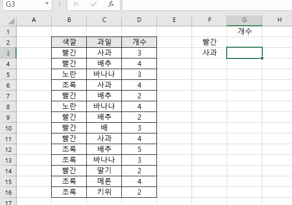 위의 그림과 같이 임의로 과일이름과 개수를 적어놓고, 사과의 개수를 수식을 이용해서 구해보겠습니다.