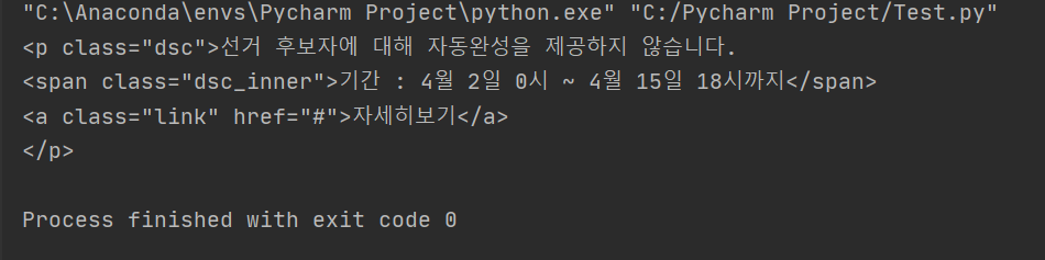 print(soup.find('p'))를 입력해 보면 아래와 같이 P태그만 가져온 것을 확인할 수 있습니다.