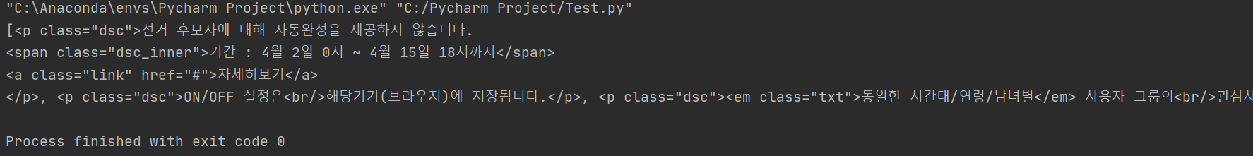 첫번째 P태그만 가져왔고, 전체 P태그를 가져오려면 'suop.find_all' 을 입력하면 됩니다. 아래는 전체 P 코드를 가져온 결과입니다.