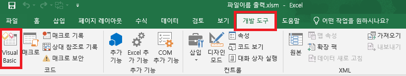 엑셀파일을 열고 상단의 메뉴 중 '개발도구' >> Visual Basic' 으로 들어갑니다.