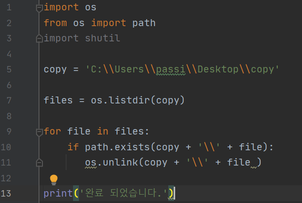 그리고 "path.exists"를 사용해서 복사할 경로에 해당 파일이 있는지 확인합니다.(이걸 하지 않으면 파일이 있을때 오류가 납니다.)