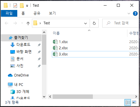 'Test'라는 이름의 폴더를 만든다음 임의로 엑셀파일을 3개 만들어 보겠습니다.