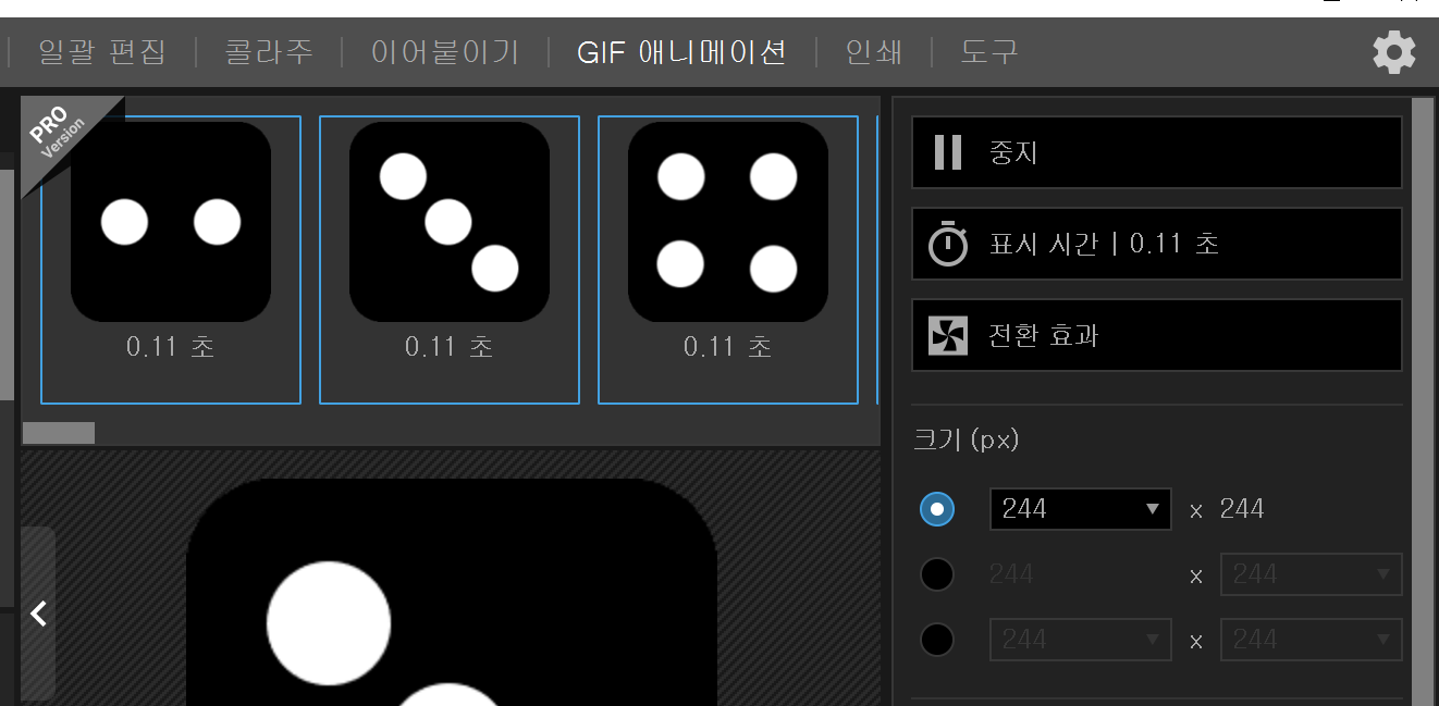프레임 속도를 적당히 조절하고 반복횟수는 3회로 해서 6개의 파일을 만들고, 끝나는 그림은 주사위 1에서 6까지 설정합니다.