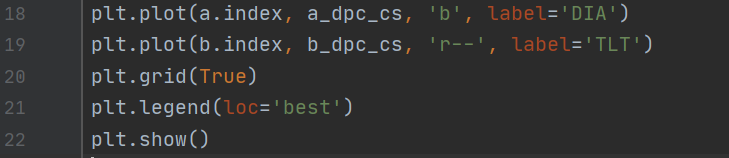 그래프 중 하나는 파란색('b') 선으로 표시하고, 다른 하나는 빨간색 점선('r--')으로 표시합니다.