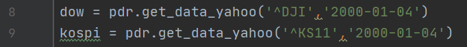 다우존스지수와 코스피지수의 종가를 데이터프레임 형태로 가져옵니다.