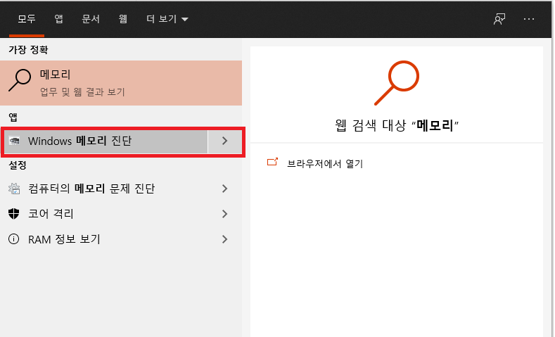 아래쪽 '시작' 버튼 옆 검색창에 '메모리'라고 입력하면, 'Window 메모리 진단'이라고 나옵니다.