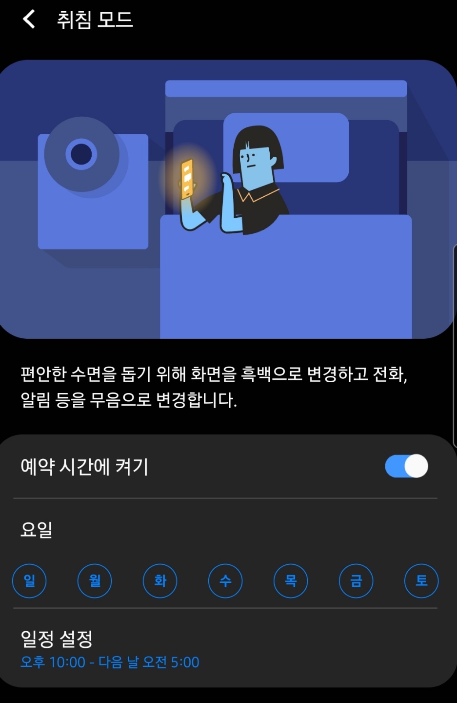 이 모드는 설정한 시간부터 화면이 흑백으로 바뀝니다.