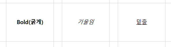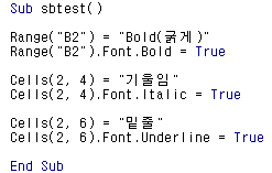 글씨를 굵게, 기울임, 밑줄을 표현하려면, 'Font.Bold = True', 'Font.Italic = True', 'Font.Underline = True' 이렇게 입력 하시면 됩니다.