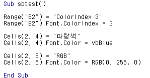 그 다음은 직관적으로 색깔을 적는 방법입니다. 'Font.Color = vbBlue' 이런식으로 색깔을 입력하면 됩니다.