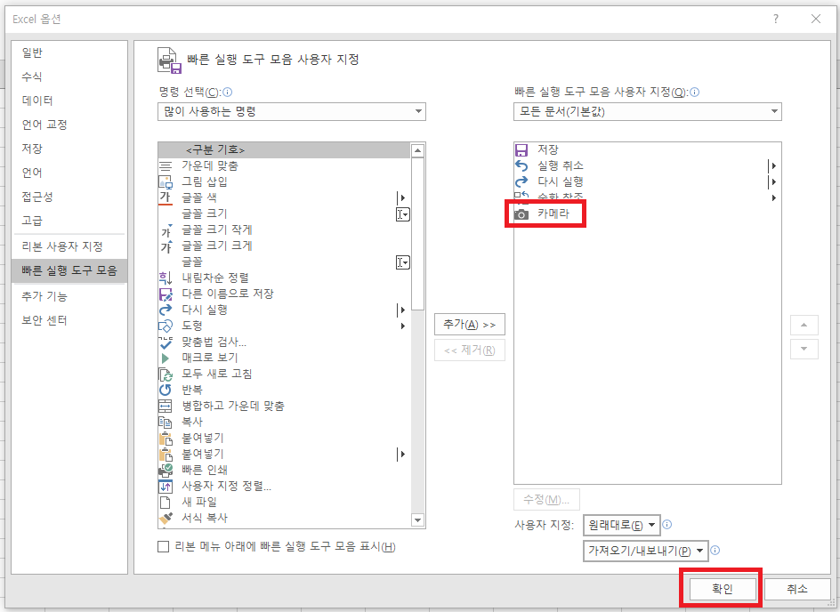 'Excel 옵션'에서 '빠른 실행 도구 모음'을 클릭하고, '리본 메뉴에 없는 명령'을 선택한 후 '카메라'를 클릭하여 추가 합니다.