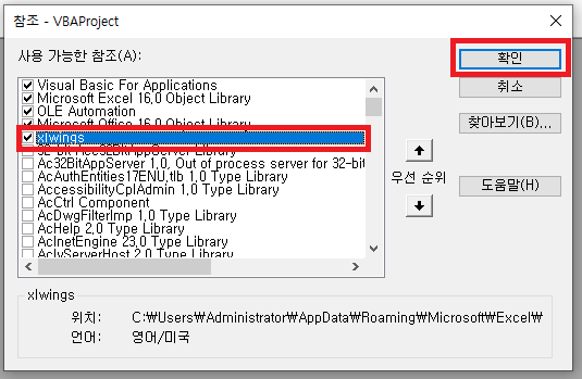 "참조-VBAProject"에서 "xlwings"에 체크 후 '확인'을 클릭하시면, 모든 설정이 완료 됩니다.