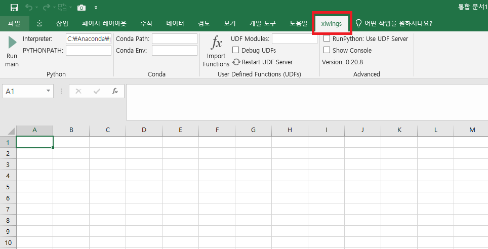 엑셀을 열어보면 상단 메뉴에 'xlwings'가 생긴것을 확인할 수 있습니다.