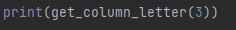 get_column_letter(index) 이런 식으로 사용하면 됩니다. index 값에 3을 넣으니 'C'가 반환 되었습니다.