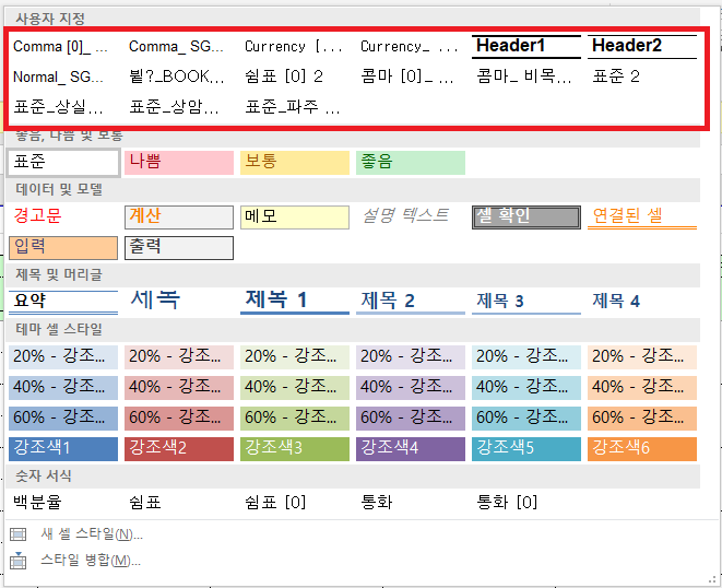 다른 사람의 엑셀파일에다 작업을 하다보면 필요없는 스타일이 만들어지게 됩니다.