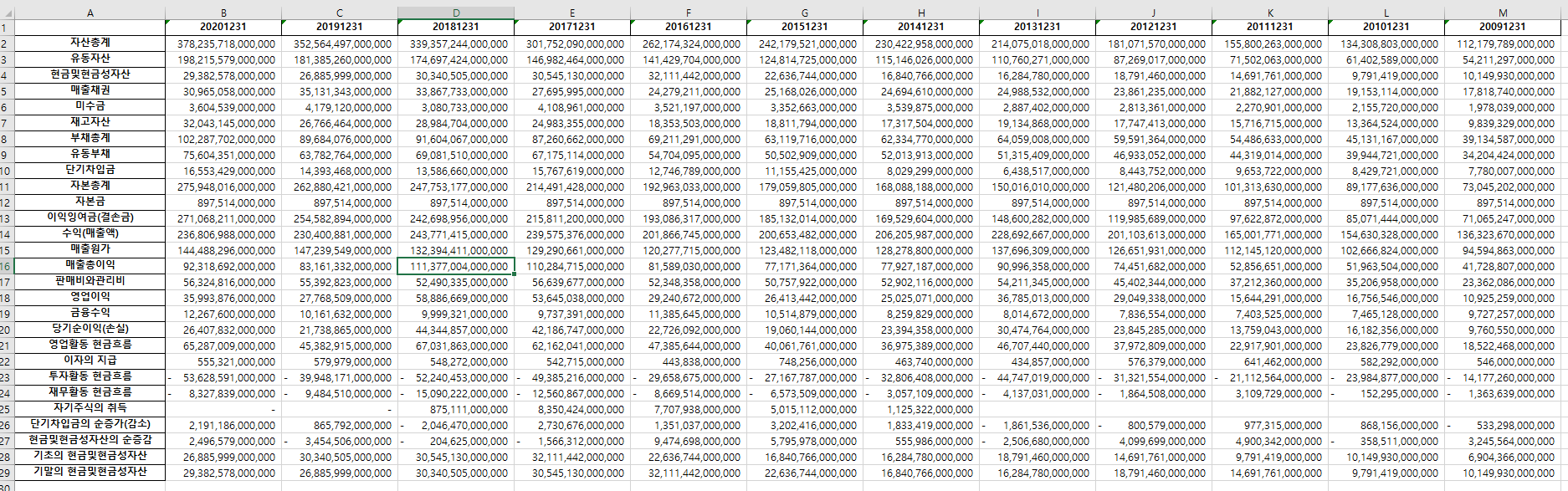 지난 포스트에 이어서 손익계산서와 현금흐름까지 10년치 데이터를 가져와 보도록 하겠습니다.