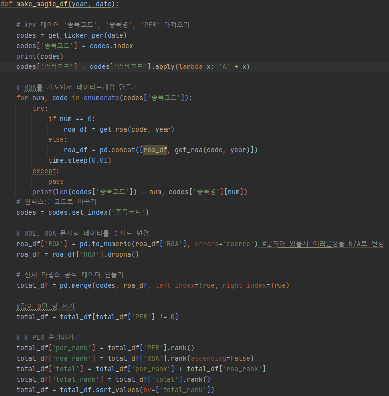 지난 포스트까지 전체 종목코드와 PER을 가져오고, 에프엔가이드 사이트에서 ROA를 크롤링해서 데이터프레임을 만들고 마법의 공식을 구현하는 코드를 작성해 보았습니다. 이전 포스트는 아래링
