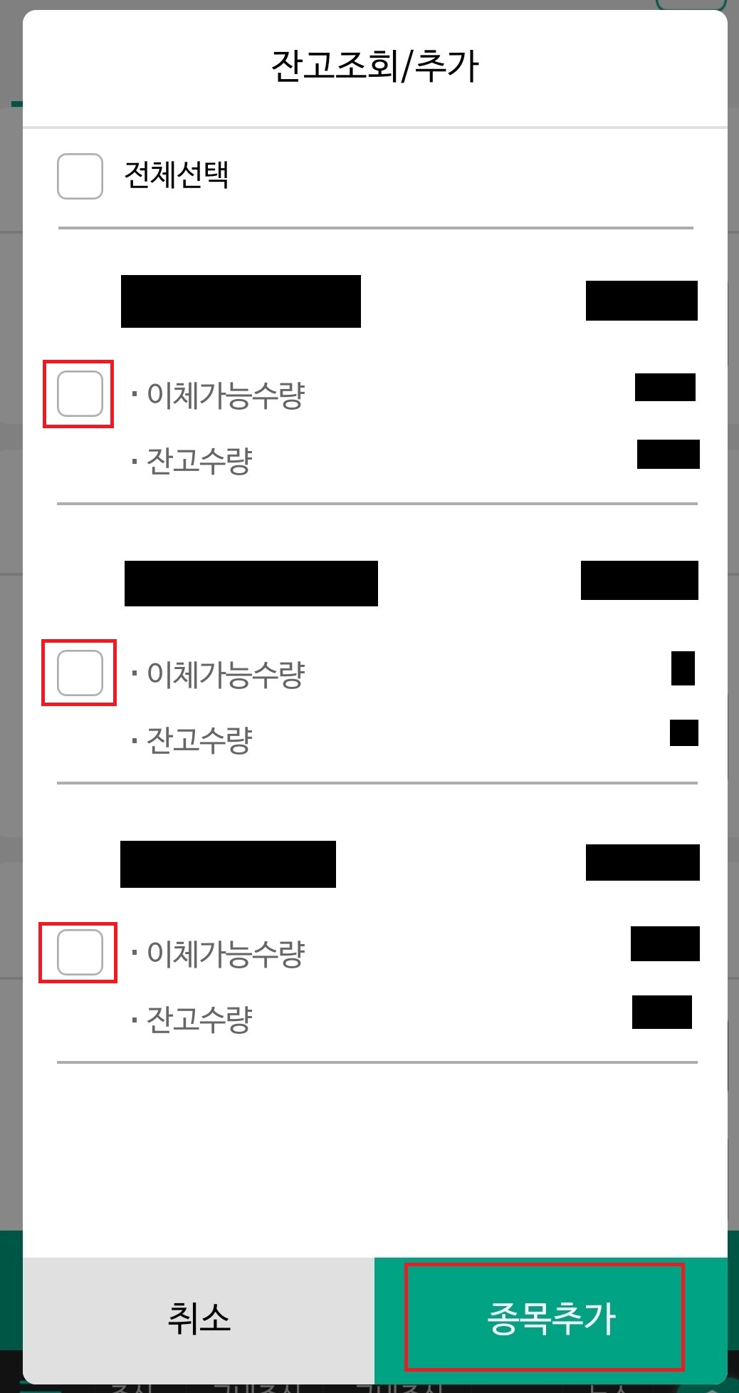 출고계좌와 입고 계좌를 선택하신 후 "잔고조회/추가"를 눌러줍니다.