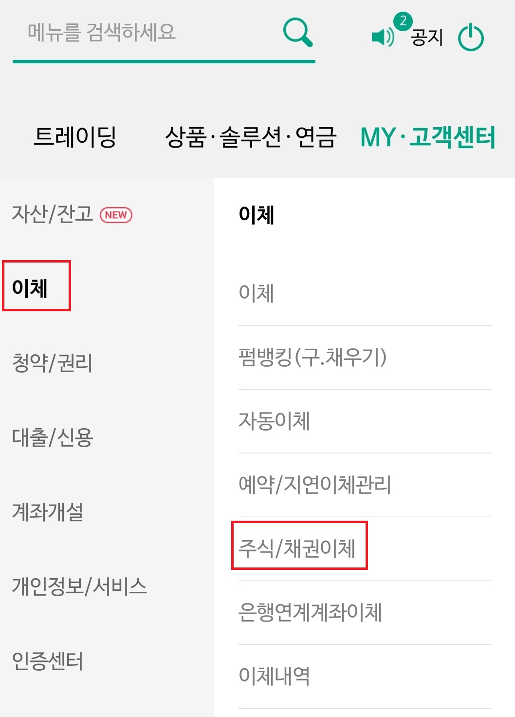 "MY 고객센터 메뉴 -> 이체 -> 주식/채권이체"로 들어갑니다.